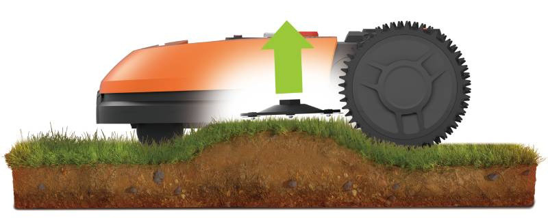 Výška žacího kotouče se přizpůsobí terénu. Tím se zabrání tomu, aby nože rozrývaly trávník, když sekačka přejíždí přes hřeben. Stejně tak jsou nože chráněny před poškozením, když robotická sekačka přejíždí po menších větvích