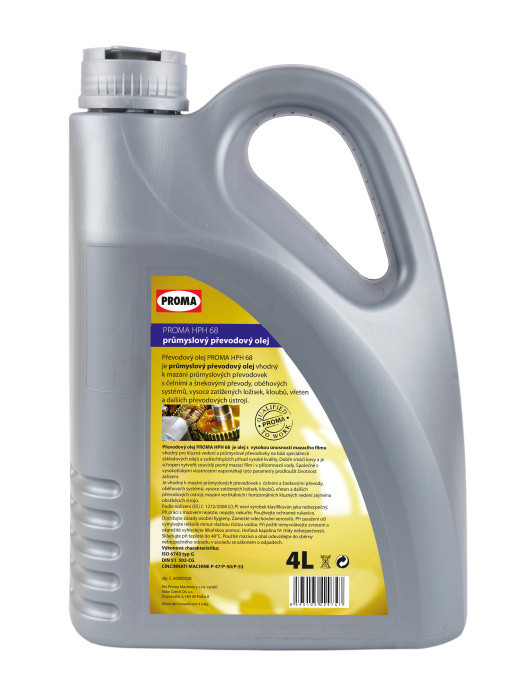 Převodový olej PROMA HPH 68 je olej s vysokou únosností mazacího filmu vhodný pro kluzná vedení a průmyslové převodovky na bázi speciálních základových olejů a zušlechťujících přísad vysoké kvality. Dobře smáčí kovy a je schopen vytvořit souvislý pevný mazací film i v přítomnosti vody. Společně s vysokotlakými vlastnostmi napomáhají tyto parametry prodloužit životnost zařízení. Je vhodný k mazání průmyslových převodovek s čelními a šnekovými převody, oběhových systémů, vysoce zatížených ložisek, kloubů, vřeten a dalších převodových ústrojí, mazání vertikálních i horizontálních kluzných vedení zejména obráběcích strojů.