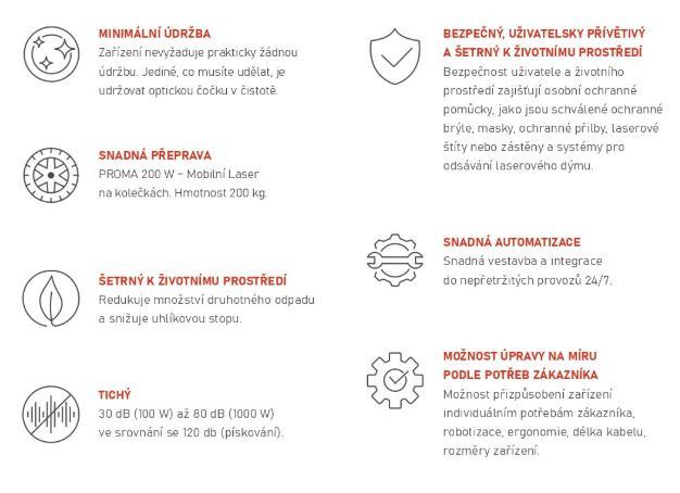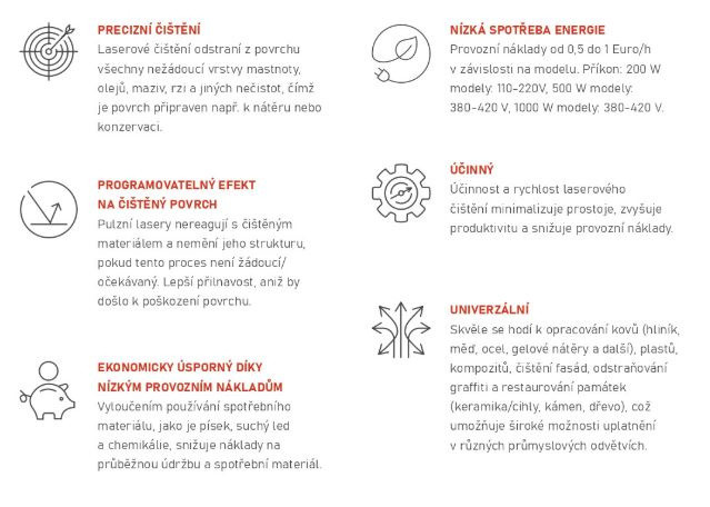 - účinnost a rychlost laserového čištění minimalizuje prostoje, zvyšuje produktivitu a snižuje provozní náklady