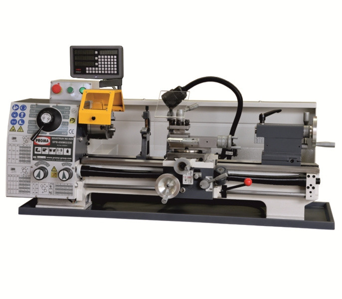Soustruh PROMA SPB-650MGD/230 s digitálním odměřováním ve všech třech osách se řadí do skupiny strojů, které jsou učeny pro náročné dílny, zámečnictví a školy. Nabízí točný velký průměr 280 mm a točnou délku 650 mm. Díky robustnímu loži a své celkové hmotnosti nabízí excelentní přesnost. Soustruh je vybaven 12 stupňovou převodovkou pro rychlé nastavení otáček vřetene, LED osvětlením, strojním podélným i příčným posuvem, sklíčidlem o průměru 125 mm a mnohým dalším.