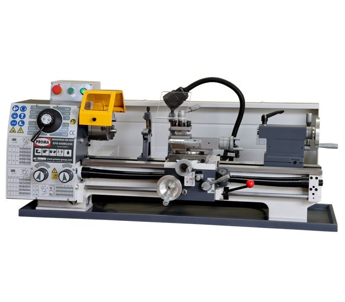 Soustruh PROMA SPB-650MG/230 se řadí mezi profesionální skupiny strojů, které jsou učeny pro náročné dílny, zámečnictví a školy. Díky robustnímu loži a celkové hmotnosti 250 kg nabízí excelentní přesnost. Tento typ stroje je standardně vybaven jak vodicím a tažným vřetenem pro řezání závitů, tak i automatickým podélným a příčným posuvem.