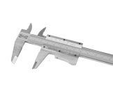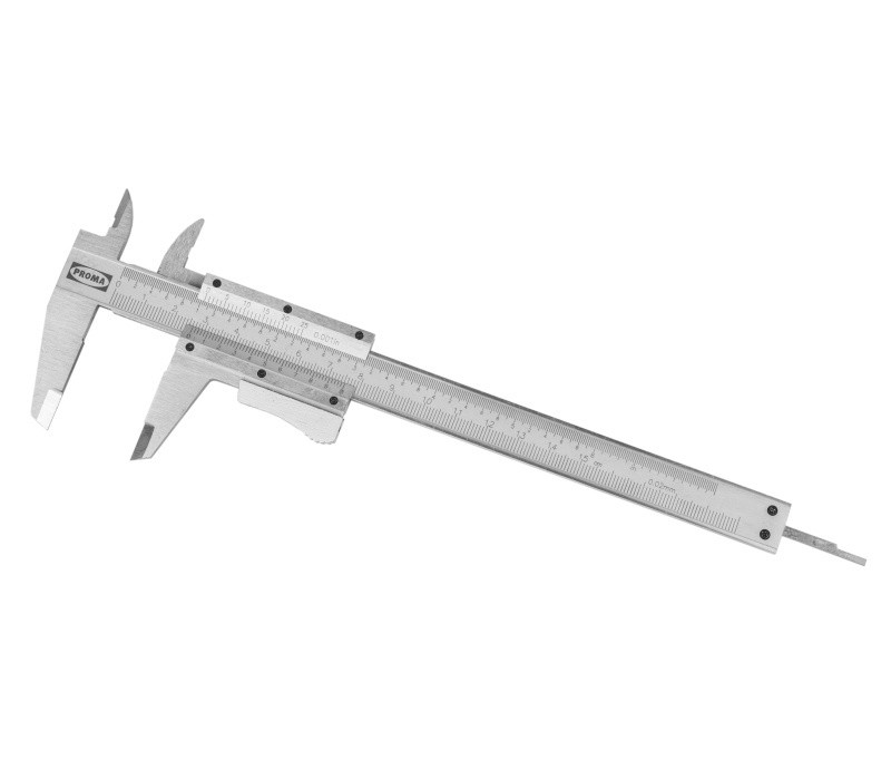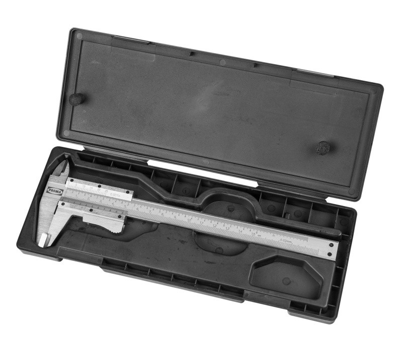 Analogové posuvné měřítko PROMA 150 mm se zvýšeným jezdcem a plochým hloubkoměrem je na zadní straně vybaveno tabulkou závitů.