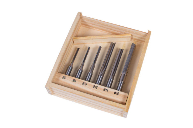 Sada dlabacích vrtáků (levé) pro PDS-135, PDS-140, PDS-220 a dlabací zařízení pro hoblovky Proma.