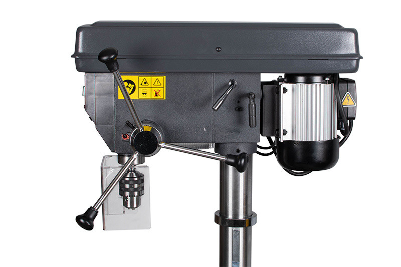 Stojanová vrtačka E-1516B/400, stroj táto třídy vyniká řadou nadstandardních funkcí a možnostmi, které uživatelům přinášejí vysokou užitnou hodnotu. Je konstruován pro vrtání, zahlubování a vystružování. Vhodné využití najde v zámečnických dílnách, opravárenských podnicích, truhlárnách, skladech ale i u domácích kutilů. Vřeteno je uloženo v kuličkových ložiscích a osazena kuželem Mk II, do kterého je možné vložit vrtací sklíčidlo nebo přímo nástroj. Pracovní stůl lze natáčet až o 360° pomocí otočného čepu a naklápět do úhlu + / - 45° od základní roviny, což umožňuje vrtání otvorů pod různými úhly.