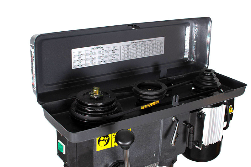 - Vrtací stůl naklápěcí (± 45°), výškově stavitelný pomocí hřebenové tyče