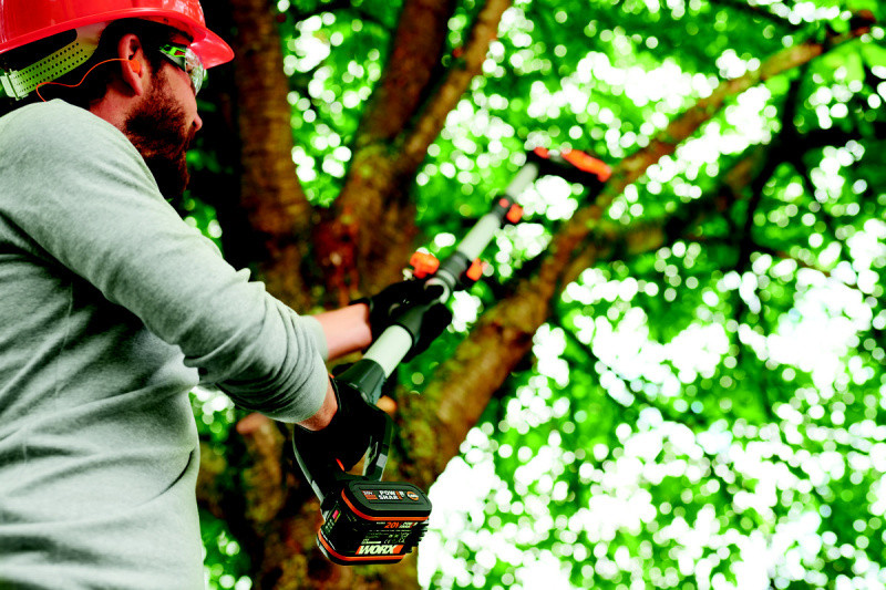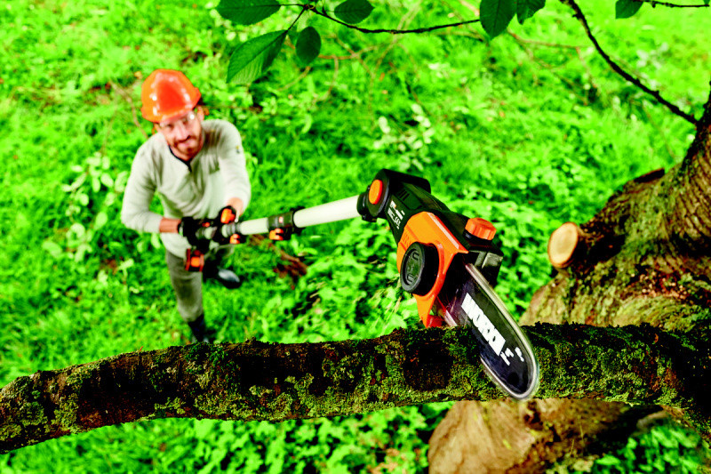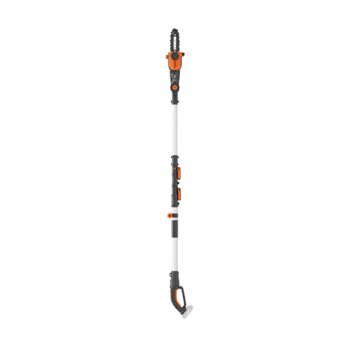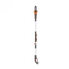 WG349E.9 - Aku prořezávací pila 20V Řadový motor zajišťuje kompaktní a lehké provedení. Automatické napínání řetězu a mazání řetězu bez použití nástrojů. Nastavitelné a teleskopické uchycení tyče bez nutnosti použití nástrojů. 3polohová hlava motorové pily. 180° otočná zadní rukojeť pro vodorovné nebo svislé řezání.